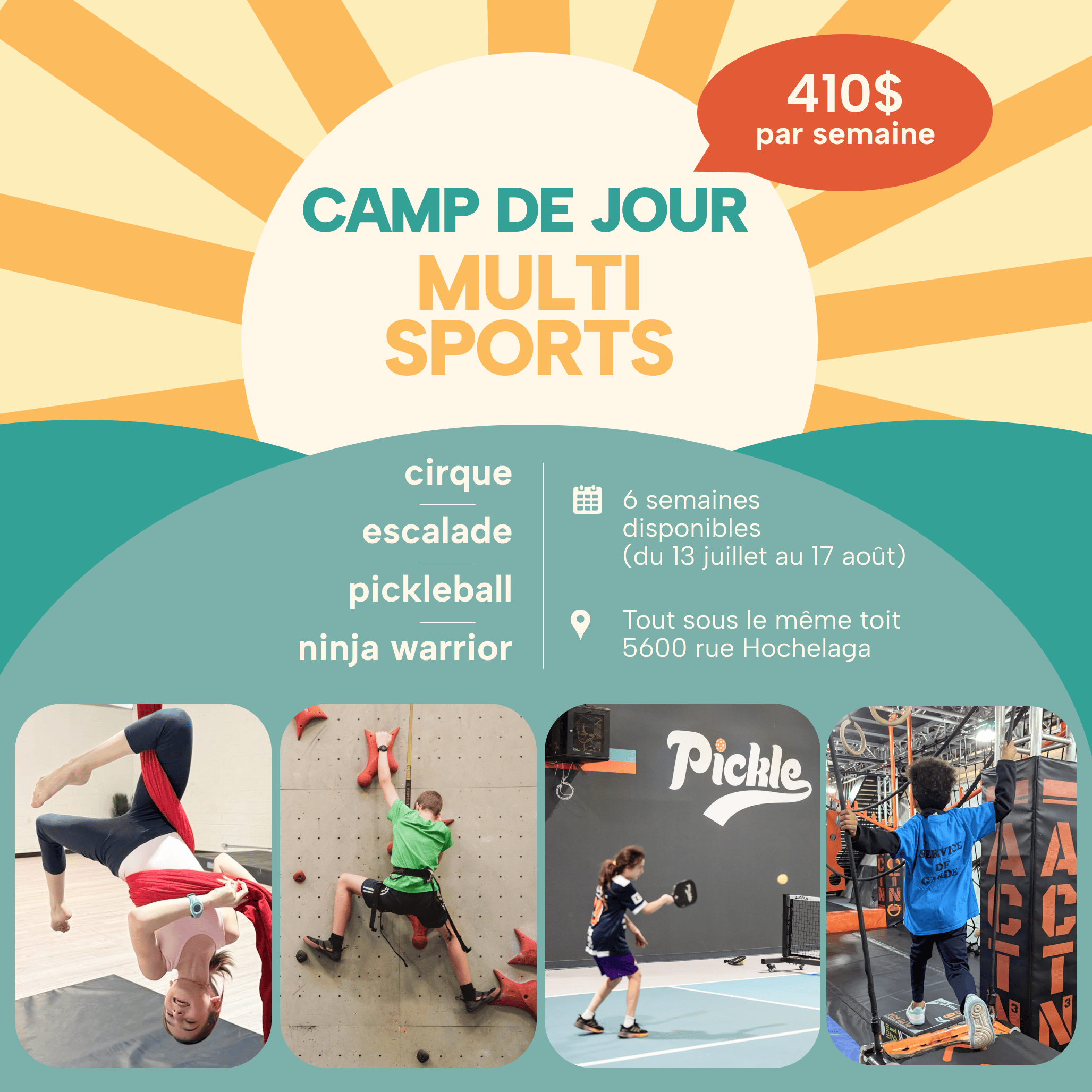 Comme l’été passé, on s’associe une fois de plus à trois centres sportifs voisins (ACTN3, Horizon Roc et l’Académie de Cirque) pour offrir un camp d’été multi-disciplinaire. En une semaine, vos jeunes se familiariseront avec le pickleball, le parcours, l’escalade et le cirque.
